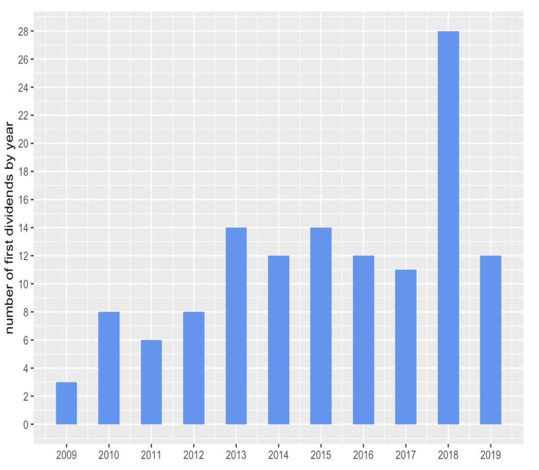 $ dividends <dbl> 0.850, 0.060, 0.430, 0.070, 0.037, 0.110, 0.060, 0.003…We could also get a sense for how these first dividend payments cluster into years by using count(year). Note we need to ungroup() first.