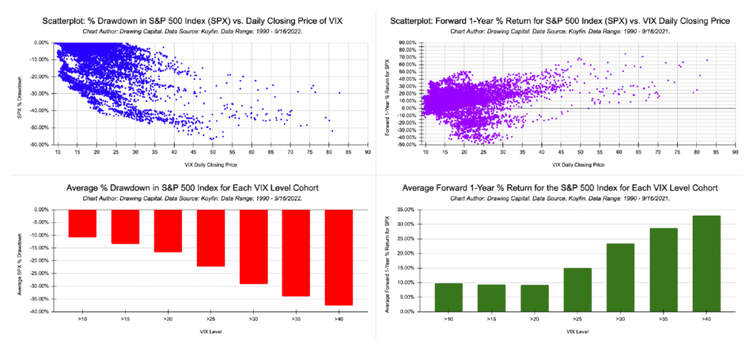 Historically and as displayed on the top-left blue chart, higher VIX levels often coincide with higher average percentage drawdowns in the S&P 500 Index.