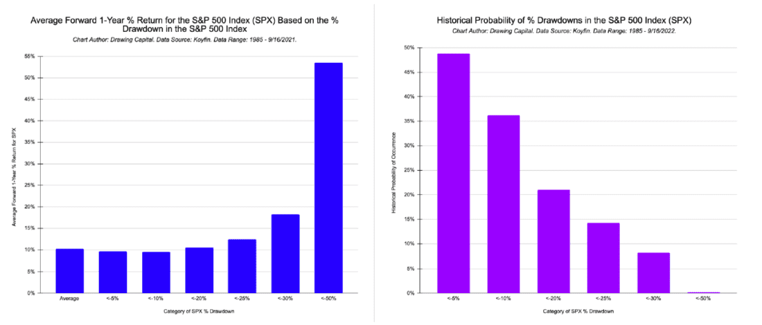In today’s newsletter, Drawing Capital utilizes a data-informed approach to analyze and assess historical data related to the S&P 500 Index, with specific attention on historical probabilities, percentage drawdowns in the S&P 500 Index, and the VIX, which is a measure of implied volatility in the near-term for the S&P 500 Index. While there are no guarantees or certainties in investing, getting the investing probabilities in one’s favor is obviously favorable.