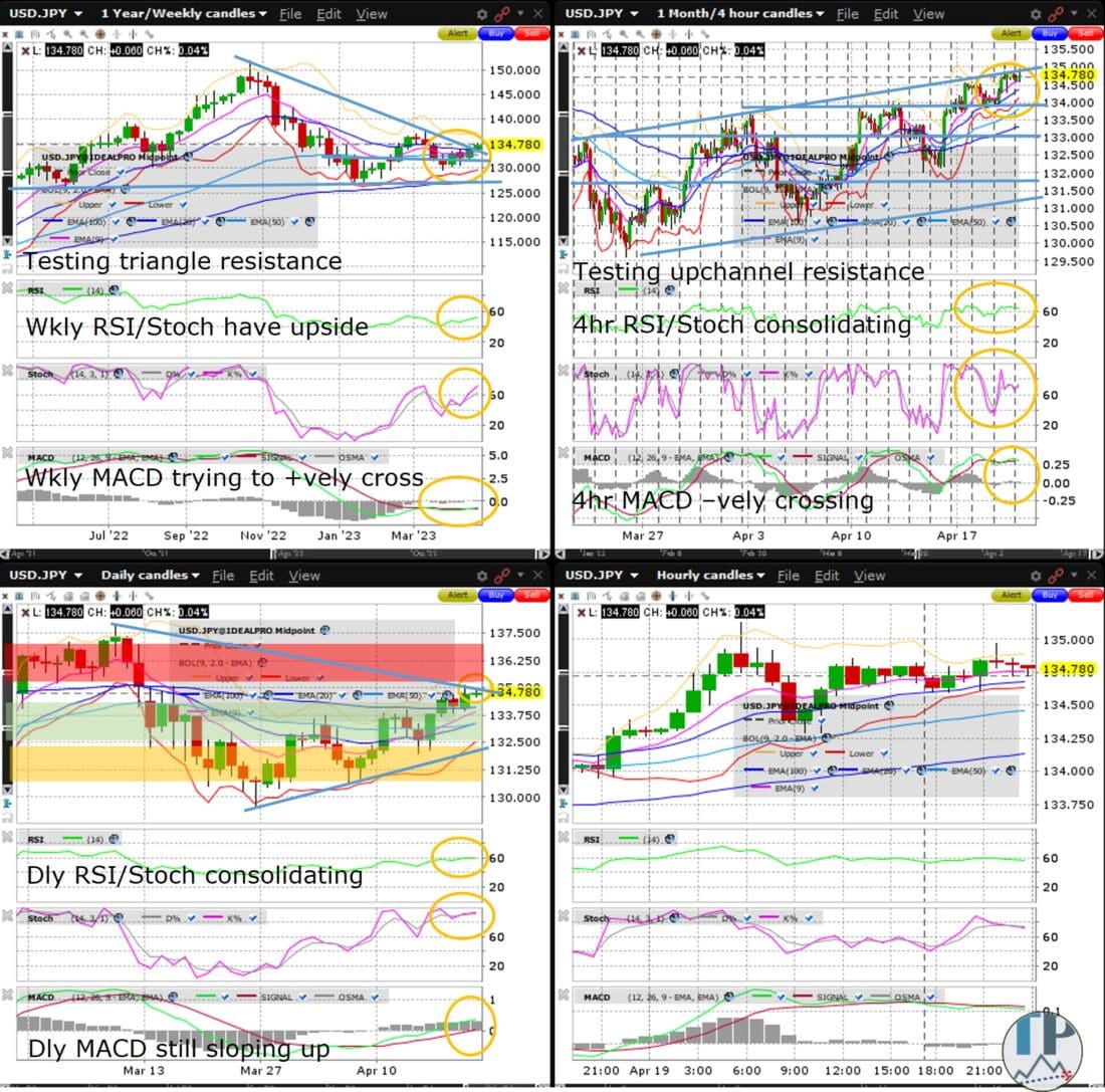 The USDJPY is forming a daily Doji at what appears to be triangle resistance (on the daily chart), hesitating as it bumps against upchannel resistance (on the 4hr chart).  Nevertheless, with the USDJPY arguably having broken this week above triangle resistance (on the weekly chart), odds are decent for a weekly close above the psychologically key 135 whole figure level.  Given that the USDJPY has comfortably reclaimed its 38.2% Fib retrace of the Jan 2021 to Oct 2022 bull market, the USDJPY does not appear likely to retest the March low before month end.  Bullish catalysts may arrive Thursday with the US unemployment claims, and Friday with the US flash manufacturing and services PMI.  Congratulations to Premium Members alerted Sep 24, 2021 to the completing of the consolidation since the July peak.  The weekly and daily RSI, Stochastics and MACD are bottomish, rallying or consolidating recent gains.  I am flat after profitably closing longs today and am looking at re-entering long in the green zone (of the daily chart), targeting the red zone for Wednesday.  The amber/yellow zone is where I might place a stop if I was a swing trader (although in my personal account with which I seldom hold overnight I sometimes set my stops tighter).  Click here for analysis on EURJPY, NATURAL GAS