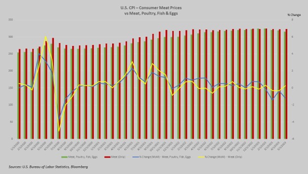 And so, given the smaller U.S. herd, it’s not surprising that the slaughter rates have been trailing 2022 levels through May already. The USDA sees beef production at 27 billion pounds in 2023, while next year’s beef production is likely to be 24.8 billion. That’s a year-over-year reduction of almost 2.3 billion pounds. Each of those figures is also a significant decline from record U.S. beef production in 2021, which was well over 28 billion pounds.
