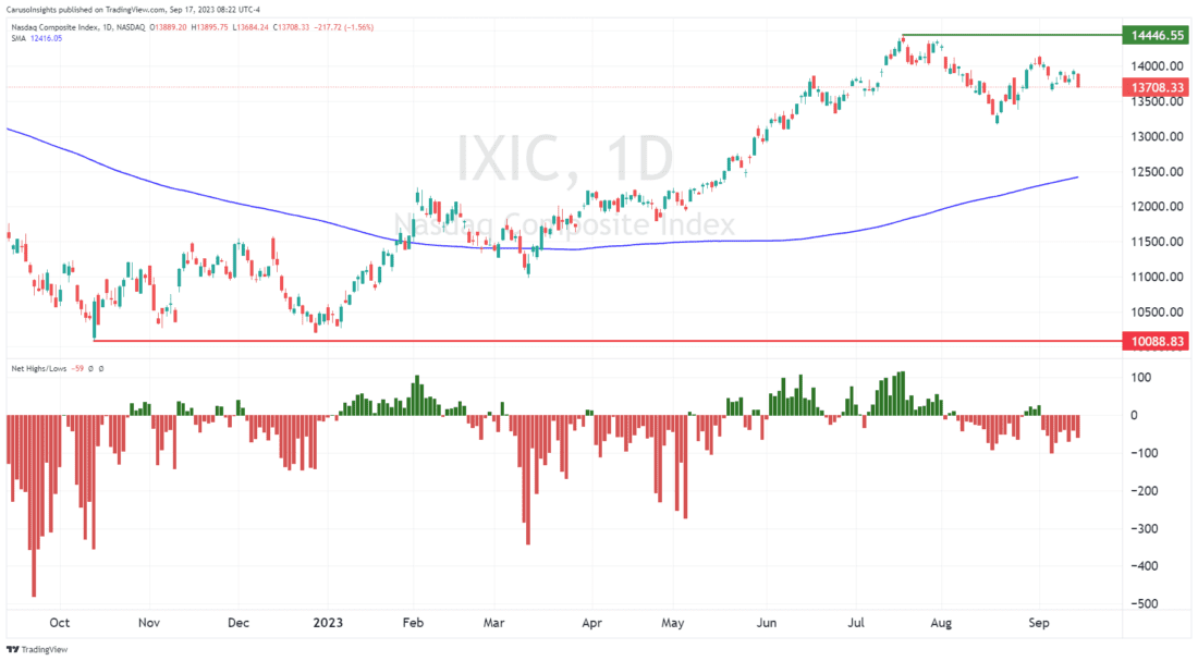 Healthy bull markets with broad participation typically have more new 52-week highs than new 52-week lows daily. In addition, healthy bull markets have a minimum of 50+ new 52-week highs each day on both the Nasdaq and NYSE composites. Friday saw only 28 new 52-week highs on the Nasdaq and 34 on the NYSE.