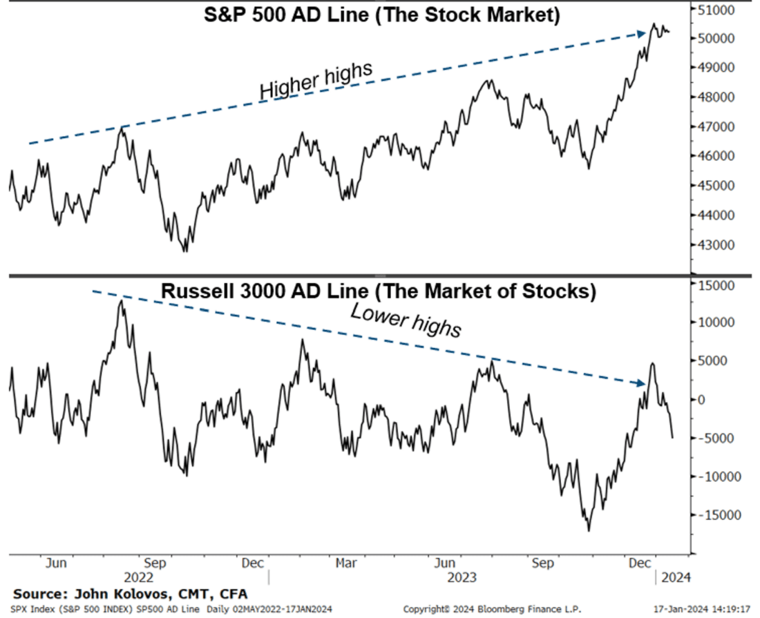 Déjà vu all over again. Party like it’s 2023! Breadth is weakening again for the broad market, and it seems like we are heading back into the have’s vs the have-nots; mega-cap growth vs everything else. The Mag 7 vs the S&P 493. A big part of our market view last year was that it was OK to be bullish on the stock market (S&P 500) but not the market of stocks (Russell 3000). In fact, there was nothing really wrong with the S&P 500 last year, which carved out its bear market bottom in October ’21, and put in place a series of higher highs and higher lows after that. The uptrend was confirmed by the Advance-Decline Line, which recently made a new high. However, the broader equity complex remains longer-term challenged, as shown by the R3K AD Line. Notice the higher highs in the S&P 500’s AD Line, whereas the Russell 3000 has lower highs. This divergence does not have to be bearish per se, but it does mean being selective and tactical in stock selection/portfolio construction while making advances above and beyond ATHs on SPX vulnerable to idiosyncratic risk.