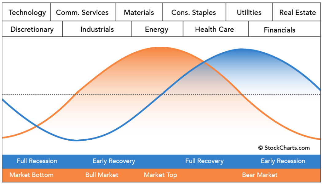 This sector rotation model presupposes that a rising market leads to higher prices which eventually cause investors to shift their investing targets. Investors move from technology to industrials and ultimately to energy stocks as the bull market peaks (see chart below).