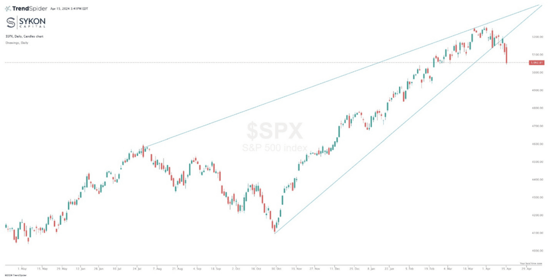 The S&P500 index has been forming a rising wedge pattern based off the July 2023 peak and October 2023 low. A rising wedge is traditionally a bearish reversal pattern and the SP&500 index has broken this pattern to the downside. The first support level comes into play at the February gap of 5032. The next support level is at the January gap and retest of 4954.