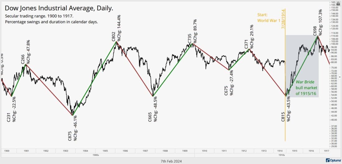 The year is 1915. Electricity, the internal combustion engine, running water in our homes, and the desire for city life over rural life are all changing the way we live. US equities have been in a secular trading range since 1900. We are in the midst of the War Bride bull market following the start of World War 1. See chart 1.