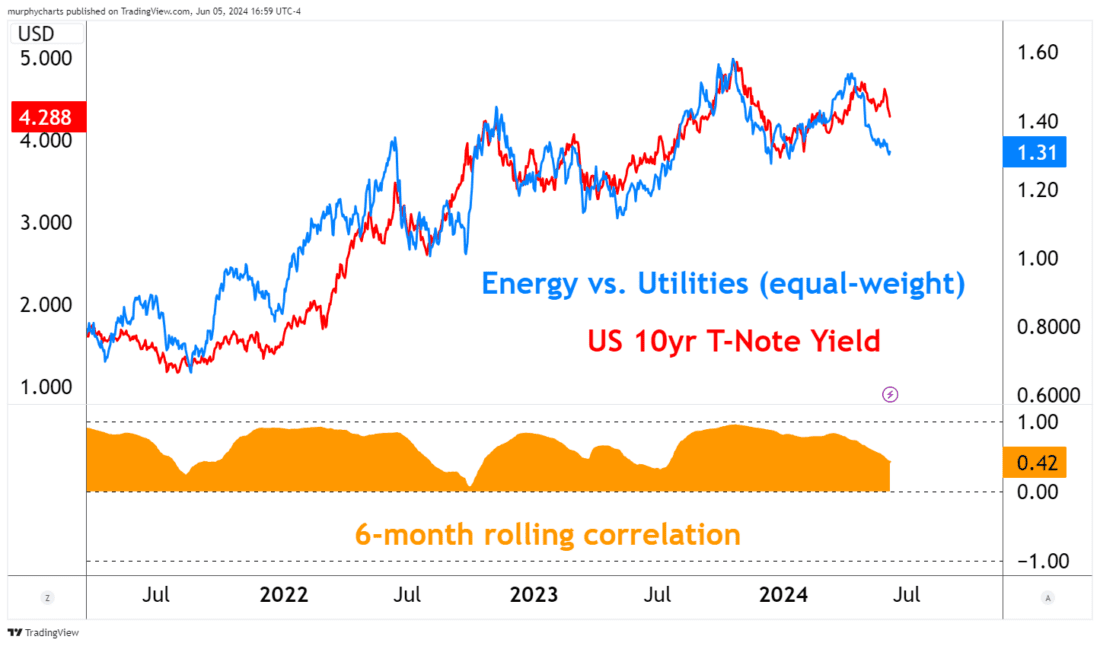 The move lower in yields is being confirmed by the Energy vs. Utilities price ratio. Energy companies and energy commodities benefit from inflationary forces. When inflation is present, interest rates tend to be higher. Utilities companies are more sensitive to rates compared to the average business due to their very high debt levels. They also carry bond-alternative like characteristics and if bonds are paying a decent coupon, investors may lose interest in the added volatility of a Utility stock.