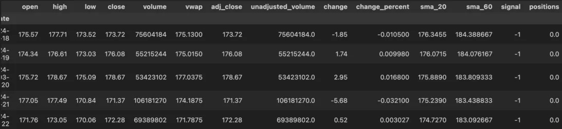 df["positions"] = df["signal"].diff().fillna(0)It works by taking a dictionary of indicators that need to be computed and also the logic to use for generating the signals that can be -1 for selling and +1 for buying. It also keeps track of the positions we’re in.