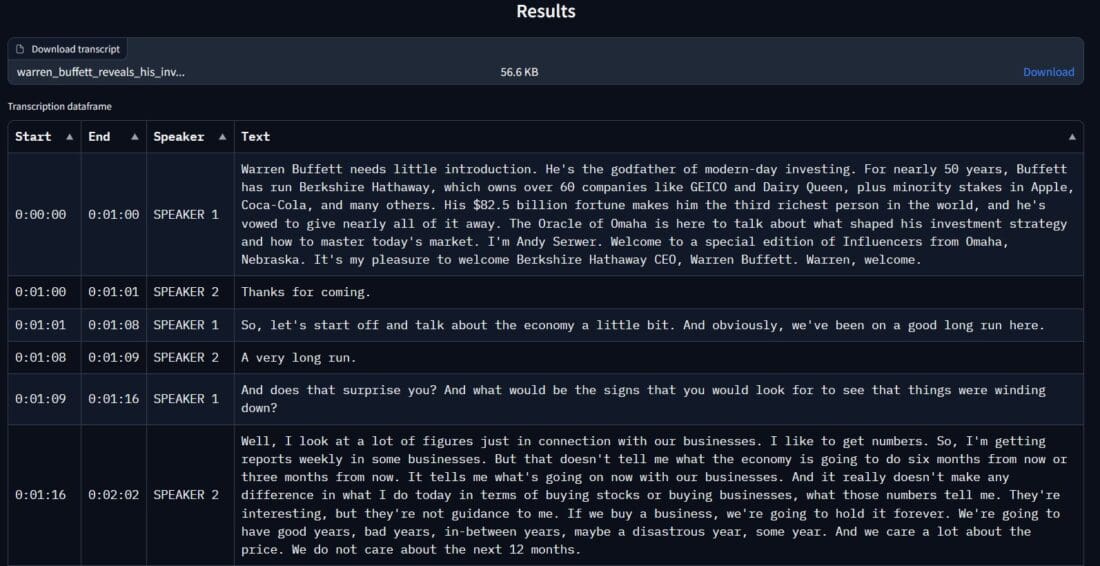 When it comes to (pre/post)processing your videos and transcripts, you can cut out the parts from the videos where Warren Buffett wasn’t a part of the conversation as you can argue that we don’t need those.