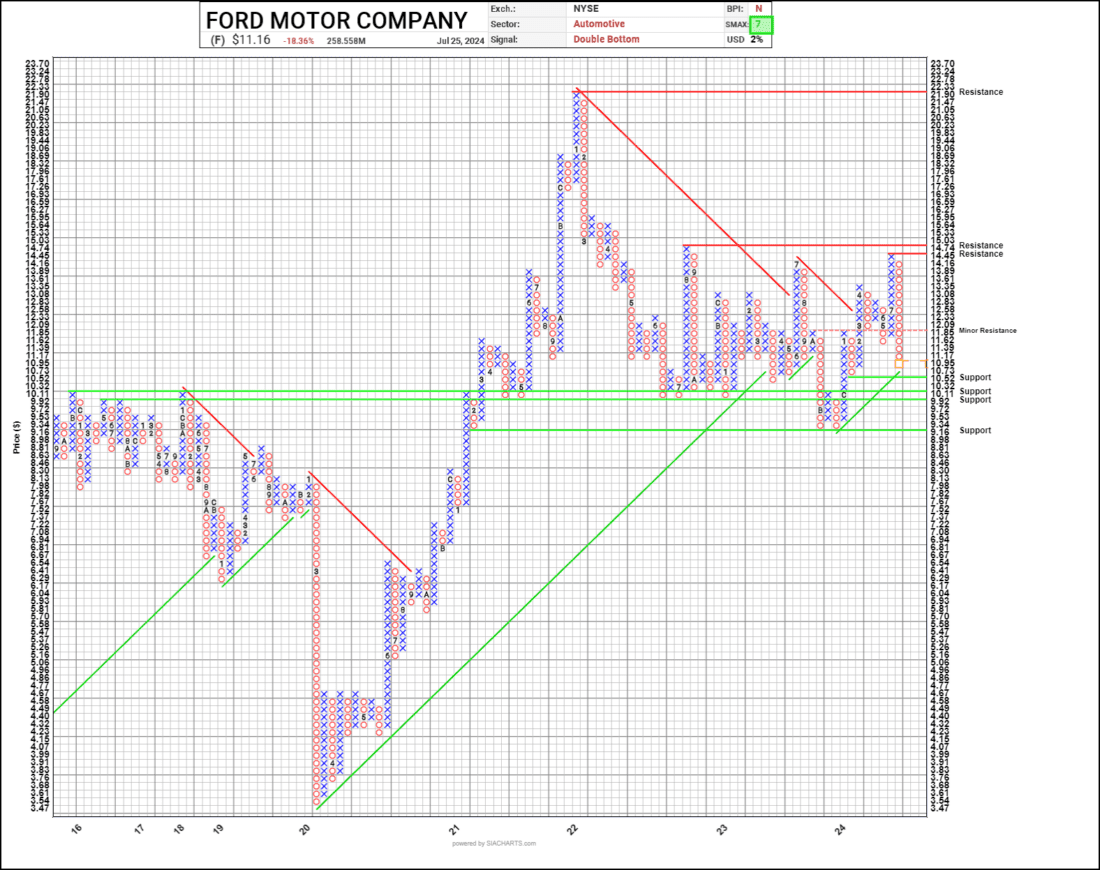 Examining the Point and Figure chart reveals more precise ranges, with support at $10.11 and $9.16, initial resistance at $12.09 (3-box reversal), and top resistance at $14.74. Overall, the chart looks decent, and if support holds, brighter days could be ahead for Ford Motor Company. Deep value/trap investors (DON’T) will no doubt find it tantalizing to buy at the $10 support level (with a stop), for a favorable risk/reward ratio on this range-bound stock. With a SMAX score of 7 out of 10 (a near-term indicator comparing an asset against various asset classes), Ford is showing strong short-term performance across all asset classes, even after recent market fluctuations.