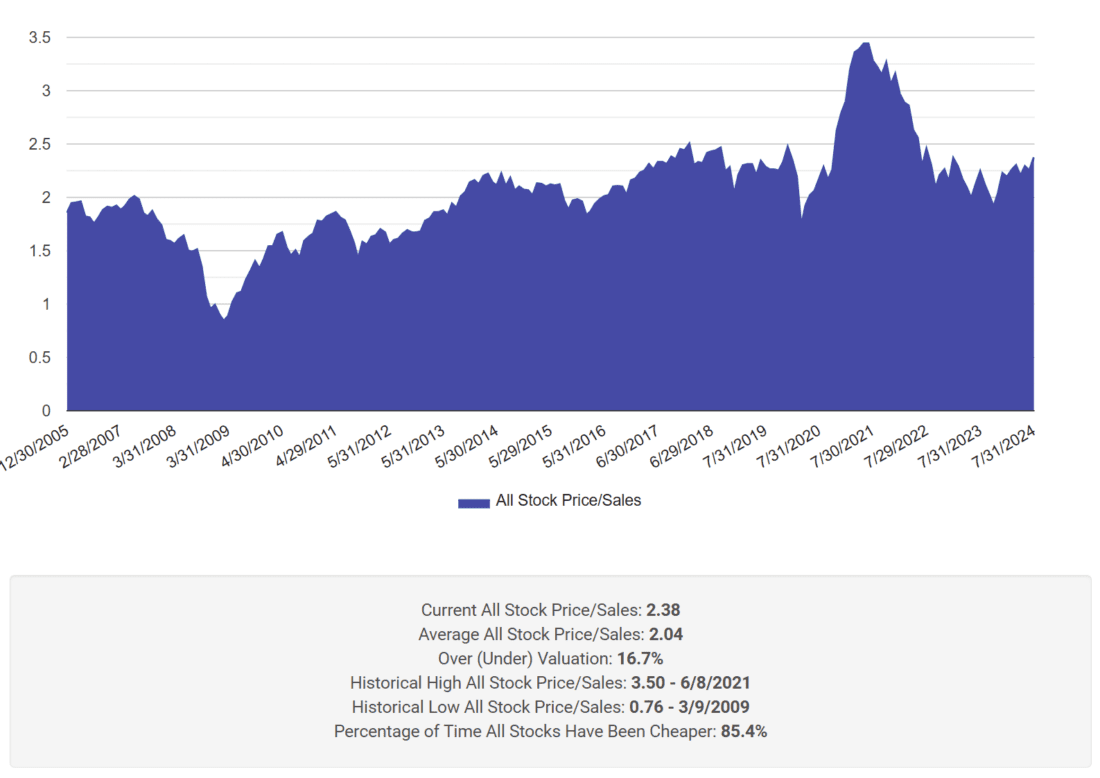 The Price/Sales is the one metric where the median stock looks very expensive. It rose from the 70th percentile in July to the 85th percentile in August.