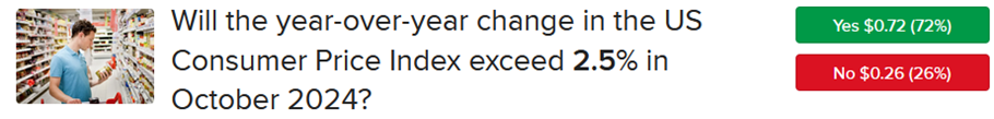 Much of my conversations this week focused on the accuracy of the IBKR Forecast Trader platform relative to national polling sources regarding this year’s elections. As we all know, polls were reflecting a neck and neck race while our IBKR Forecast Trader marketplace during most trading days since early October favored a Trump win by a wide margin. Now that election day is behind us, we have a long list of economic indicator contracts available to trade as well. Participants may choose Yes or No. Finally, I’m seeing some compelling opportunities in our marketplace for next week, with the Consumer Price Index (CPI), Producer Price Index (PPI) and Retail Sales report on the economic calendar. The Yes for the PPI is priced at 72% for a figure above 1.3% year over year (y/y), but wholesale prices have increased during the period while Wall Street economists’ have a median estimate of 2.3%. CPI and Retail Sales don’t offer much of a discrepancy relative to expectations, with the Yes priced at 72% and 51% for data above 2.5% y/y and 0.3% month over month while the median projections stand at 2.6% and 0.3%, respectively.