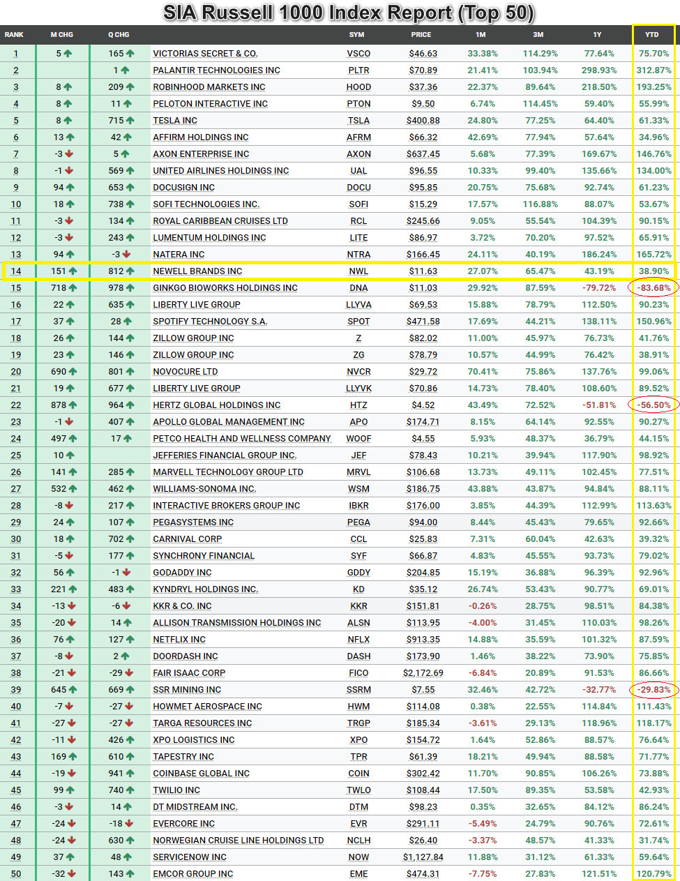 The significance of this rally is further highlighted in the attached table, which presents the top 50 positions in the SIA Russell 1000 Index Report. Here, the YTD return numbers have been emphasized, with many companies showing impressive returns exceeding 75%. However, a few names, marked in red, still show negative YTD returns, indicating that some are still catching up to the impressive performance of others. Newell Brands, with its 38.90% YTD return, remains one of the lowest performers among the top 50, likely due to its relatively recent rise.