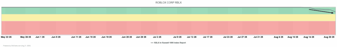 Taken together, the resistance levels mentioned above and the support levels sitting far below current prices may point to less favorable risk/reward parameters for SIA practitioners. One remaining technical positive is the stock’s continued inclusion in the favored zone of SIA Russell 1000 Index Report, although RBLX has fallen sharply in ranking, now sitting at position #175 out of 1000 names, down 170 spots in the past month. The SMAX score has also declined to a current reading of 5 out of 10, potentially indicating weaker relative strength against a basket of five alternative asset classes.