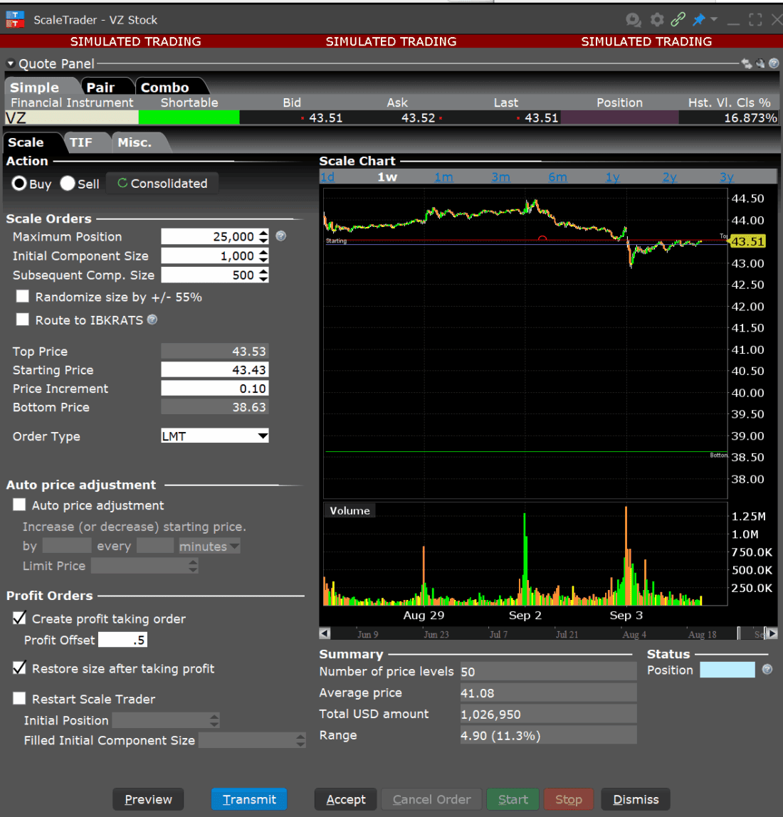ScaleTrader is a sophisticated trading algorithm within Interactive Brokers’ platform that helps traders scale into large positions efficiently. The essence behind the algorithm is that it allows investors to buy at decreasingly lower prices or sell at increasingly higher prices. ScaleTrader can be used to buy or sell positions in single instruments, pair trades, or combinations. Whether you’re looking to minimize market impact, improve average execution prices, or implement automated trading strategies, ScaleTrader provides functionality that goes well beyond conventional order types. Investors can use ScaleTrader to trade Stocks, ETFs, Options, Futures, FOPs, Currencies, Bonds, and Warrants.