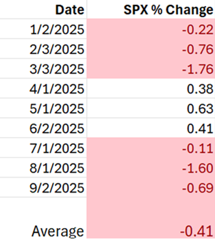Looking ahead, we see that October is a month that has averaged solidly positive returns of 1.31% over the prior 25 years, but we have a fair dispersion of results as well. The odds are a bit better for an up month, 10 of 25, but that is hardly a resounding consensus. When we narrow the data set to Octobers that follow positive Septembers, we see that five of them resulted in lower SPX returns for that month. If you’re looking for a definitive pattern, I’ve yet to find one.
