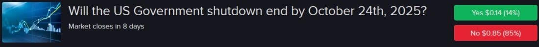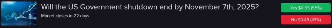 But the short-term looks bleak, folks, with the contracts for tomorrow and Oct. 24 carrying probabilities of just 2% and 14%, as Democrats and Republicans fail to reach some kind of middle ground that could generate a reopening. The issue at the forefront is health care, with Medicaid cuts and expiring Obamacare era health insurance subsidies driving the gridlock. We are poised to add more dates for new contracts in the upcoming days if a deal isn’t reached.