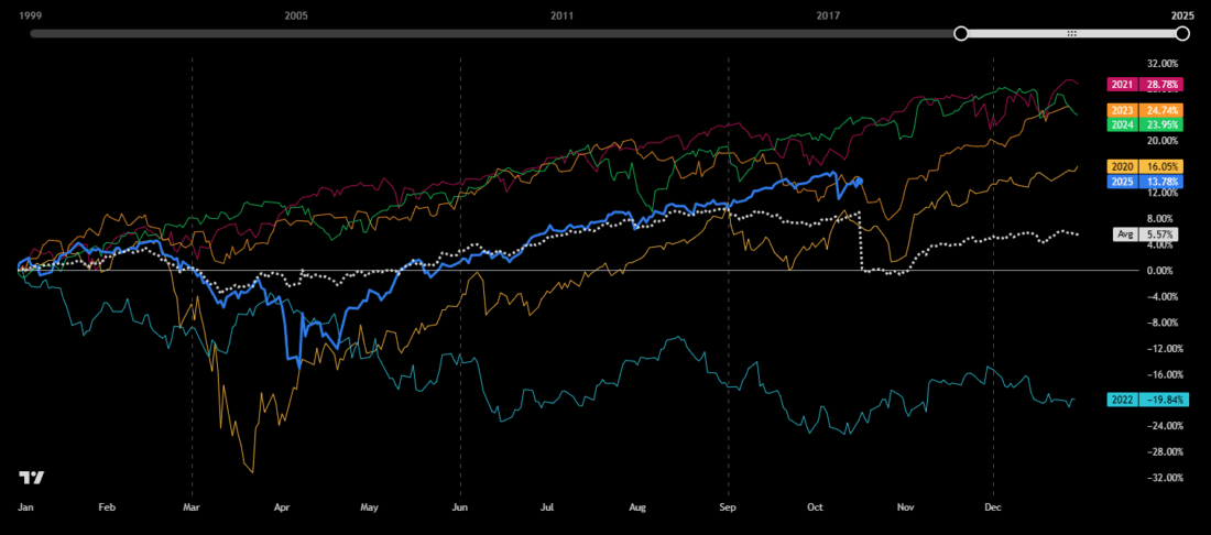 A look at post-COVID seasonality (2020 onward) shows that, on average — as indicated by the white dashed line — the S&P 500 tends to weaken from the third week of October through month-end.