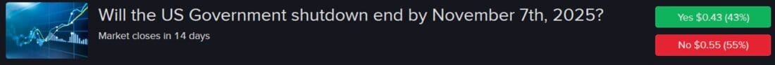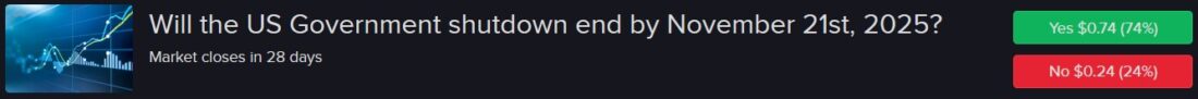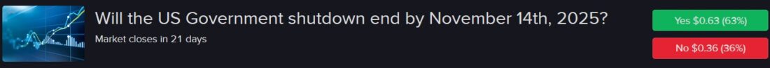 The IBKR prediction market implies a 50% chance that the government shutdown will end by Nov. 10. Meanwhile, the odds for a reopening by Oct. 31 and Nov. 7 are 11% and 43%, respectively, while the chances for the shutdown to end by Nov. 14 and Nov. 21 are 63% and 74%.