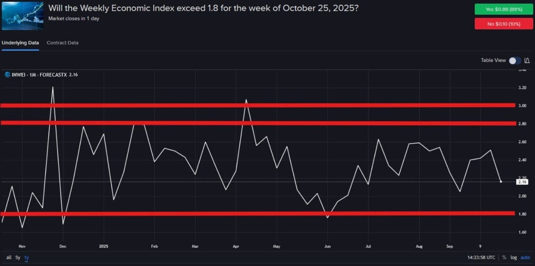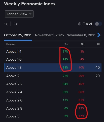 The Weekly Economic Index has rarely dropped below the 1.4%, 1.6% 1.8% levels or rose above 2.8% and 3% in the past twelve months. And although it has been trending lower lately, a result of the government shutdown weighing on conditions, I believe tomorrow’s print is poised to come in range-bound and won’t surprise much. Against this backdrop I find the risk-reward profiles of the “Yeses” at 1.4%, 1.6% and 1.8% attractive, as well as the “Nos” at 2.8% and 3%. The thresholds are ranging from $0.88 to $0.97 in cost.