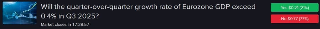 The last time the EU’s GDP print exceeded 0.4% was in 2022’s second quarter and I don’t envision a climb above that in tomorrow’s report. The median estimate is at 0.1% and recent economic signals have pointed to improving, but at the same time, modest growth that doesn’t support a 0.5% increase. Meanwhile, the indicator has a subdued deviation rate, meaning that it tends to arrive near projections. For the reasons mentioned, I find the “risk-reward profiles of the “Nos” at 0.4%, 0.65% and 0.9% attractive, and they’re ranging from $0.77 to $0.95 in price.