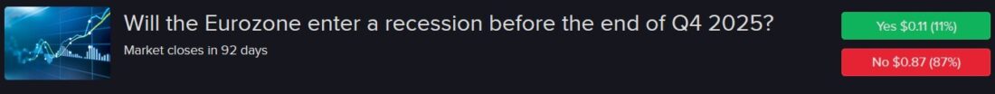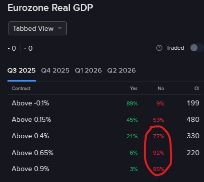 Improving conditions in the EU and a subdued chance that tomorrow’s number or the figure from the fourth quarter would come in below 0 signal an attractive entry point for the “No” at $0.87 in my opinion. For “Team No” to lose here, GDP stats for both prints, reflecting 3rd and 4th quarter performances, must be negative, and the path for that is particularly narrow.