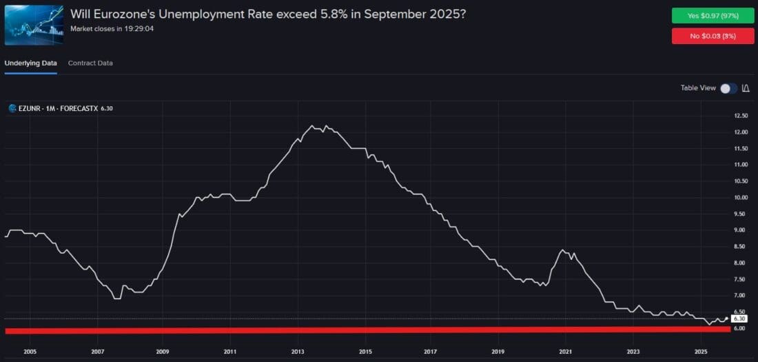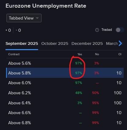 The EU’s unemployment level is expected to remain unchanged at 6.3% and there’s a very low chance in my view that tomorrow’s number will breach the 6.1% statistic to the downside, which would be the lowest result on record. Recent economic data point to labor market softening, not strengthening, and this indicator has a subdued deviation rate. For those reasons, I find the risk-reward profiles of the “Yeses” at 5.6% and 5.8% attractive; they’re going for $0.97 each.