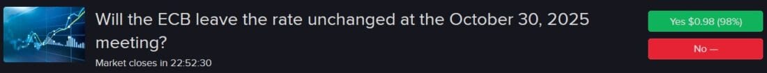 A 98% chance exists that the European Central Bank will hold rates steady tomorrow as the committee awaits more growth, employment and inflation reports to gauge the next appropriate steps for monetary policy.
