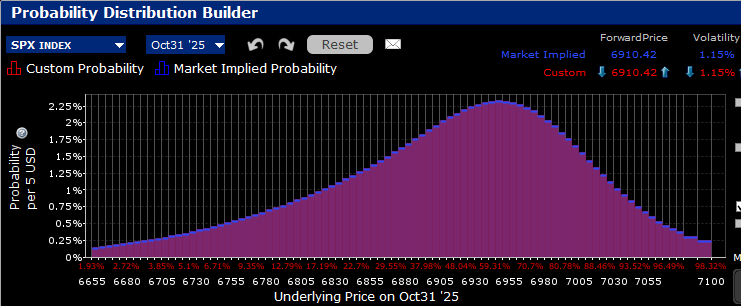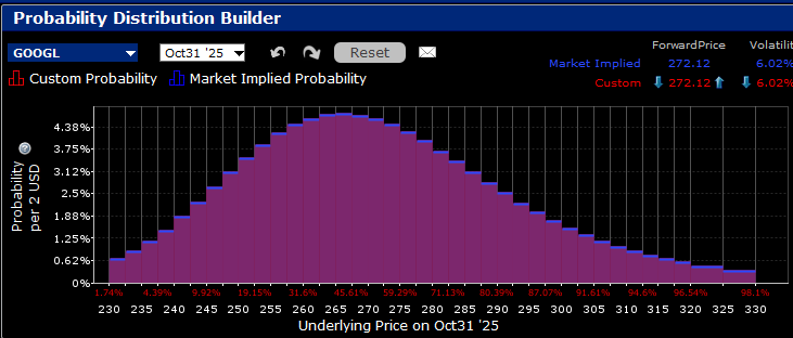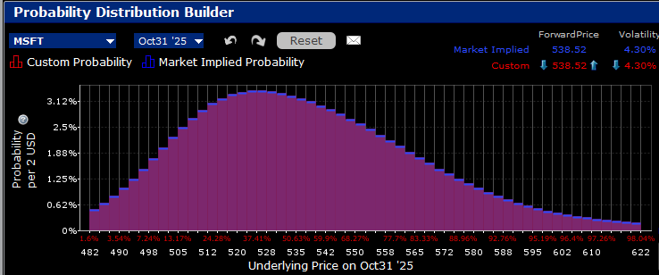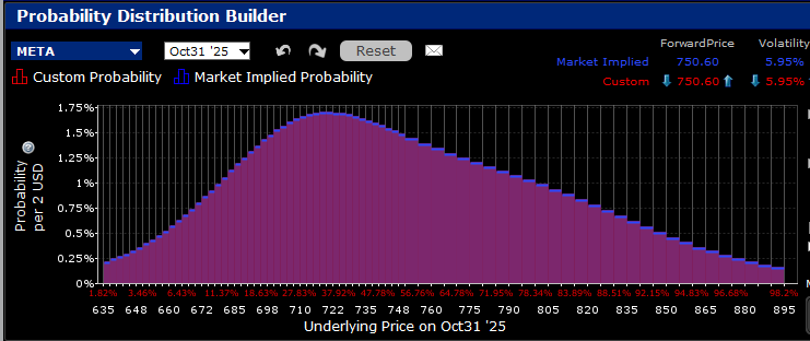 All three of the above charts for MSFT, GOOGL, and META respectively show peak probabilities slightly below the current market prices. The implied daily volatilities of 4.3%, 6.02%, and 5.95%, respectively, are roughly commensurate with these stocks’ longer-term average post-earnings reactions, though we do see some difference from recent activity. MSFT rose +3.95% after its last report, GOOGL, which is notably sparse with guidance, rose only 1.02% and 1.68% after its last two reports, while META zoomed 11.25% after its last earnings. In short, MSFT is reflecting a rough status quo, GOOGL is pricing in the potential for a bit more volatility, while traders do not expect a repeat of META’s recent moonshot.