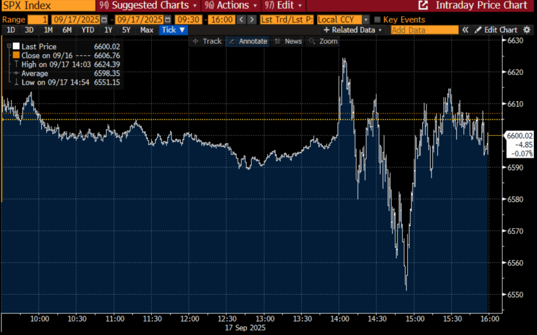 Below is a brief visual reminder about the volatility that can ensue during Chair Powell’s press conference. The chart is from the last FOMC day on September 17th. We understandably traded in a narrow range prior to the 2:00 rate decision, but then we had an intraday swing of over 1% before finishing essentially unchanged on the day.