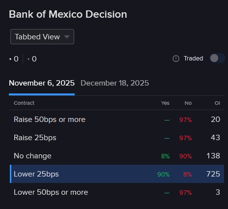 The Bank of Mexico (Banxico) is expected to reduce its benchmark rate by 25 basis points at its upcoming meeting with a 90% degree of confidence. The other option on the table is to keep the level steady, while hiking or a deeper cut is off the board.