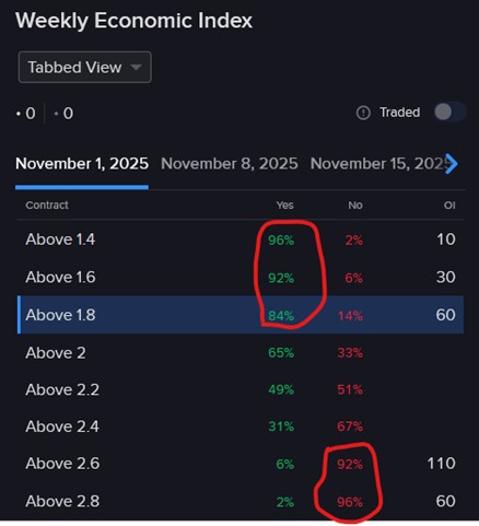 The Dallas Fed’s Weekly Economic Index is likely to remain range bound tomorrow as recent indicators don’t point to a significant acceleration or deceleration in activity. The risk-reward profiles of the “Yeses” at 1.4%, 1.6% and 1.8% appear attractive at $0.96, $0.92 and $0.84, and the same is true, in my opinion, for the “Nos” at 2.6% and 2.8%, which are priced at $0.92 and $0.96. The five thresholds have only been breached a handful of times this year as you can see from the chart below. A 0.2% weekly drop or a 0.61% climb is required for this combination trade to lose money, which is an extremely narrow path in my view.