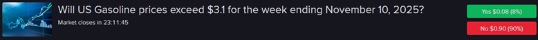 It’s highly unlikely that gasoline prices rose from $3.019 to $3.10 in just a few days, a sharp climb requiring an $0.081 or 2.68% increase in just seven days. Advances exceeding 8 cents are rare, occurring just once this year and in 2024. Meanwhile, trading in gasoline and crude oil futures don’t support a jump of that magnitude, since the former’s performance is approximately +1.9% during the period while the latter is -1.8%. Furthermore, movements in those markets are more volatile than retail gasoline prices and adds credence to the belief that the “No” at $3.10 is undervalued at $0.90.