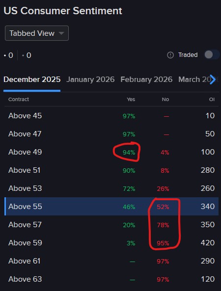 Consumer Sentiment came in at 53.3 today and given the index’s subdued revision rate, there are undervalued opportunities as they relate to the final reading to be released on December 19 in my opinion. The “Yes” at 49 and the “Nos” at 55, 57 and 59 offer favorable risk-reward dynamics in my opinion; they’re going for $0.94, $0.52, $0.78 and $0.95. A rare revision amounting to -4.3 or + 1.75 would be needed for any of these trades to lose money. I also featured the last release of the sentiment index in October.