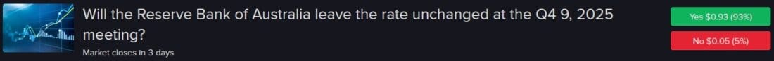 The Australian central bank is expected to hold rates steady with a 93% degree of confidence at its meeting on Monday in light of stronger consumer demand and a sharp recovery in the housing sector. There is a 7% chance of a 25-basis point cut against the backdrop, however.
