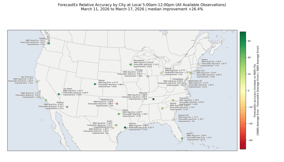 I disaggregate this information into individual locations in the map below, which shows the average errors for both systems over the date range (March 11th through March 17th), pooled over the 5:00 am to noon local hours. We can see that ForecastEx is showing improvement over National-Weather-Service-LAMP in 19 out of 23 cities, with a median improvement of over 26%. It is an open question whether this geographic variation represents noise or something more systematic.