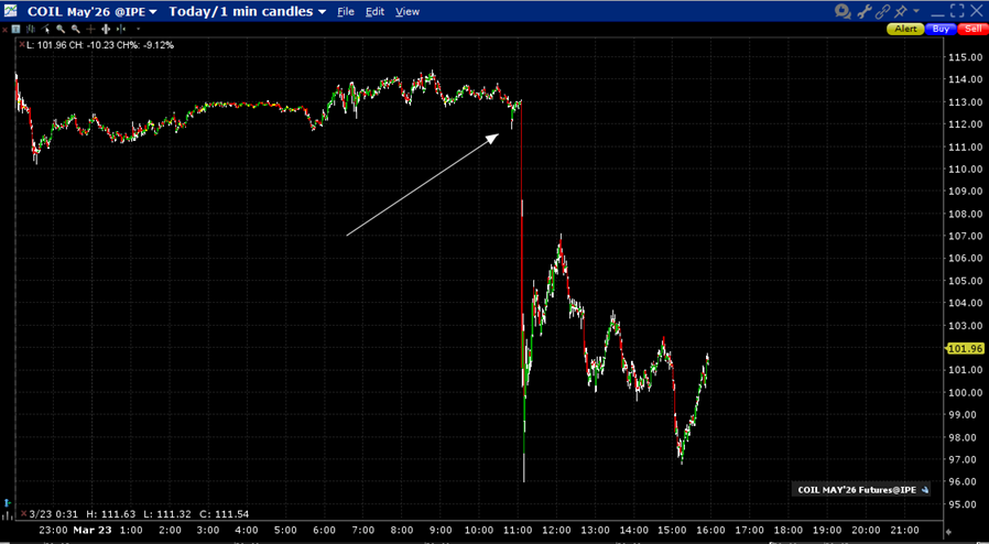 “Note the small spike lower in May Brent crude futures (COIL) at 10:49 GMT, about 15 minutes before the social media post.” Enough said. This is what he and his gang do.