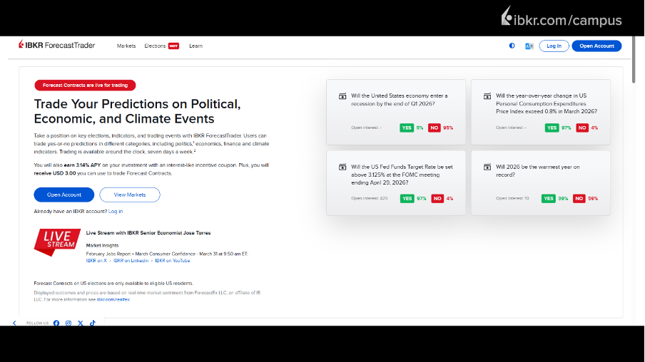 Interactive Brokers LLC is a CFTC-registered Futures Commission Merchant and a clearing member and affiliate of ForecastEx LLC (“ForecastEx”). ForecastEx is a CFTC-registered Designated Contract Market and Derivatives Clearing Organization. Interactive Brokers LLC provides access to ForecastEx forecast contracts for eligible customers. Interactive Brokers LLC does not make recommendations with respect to any products available on its platform, including those offered by ForecastEx.
