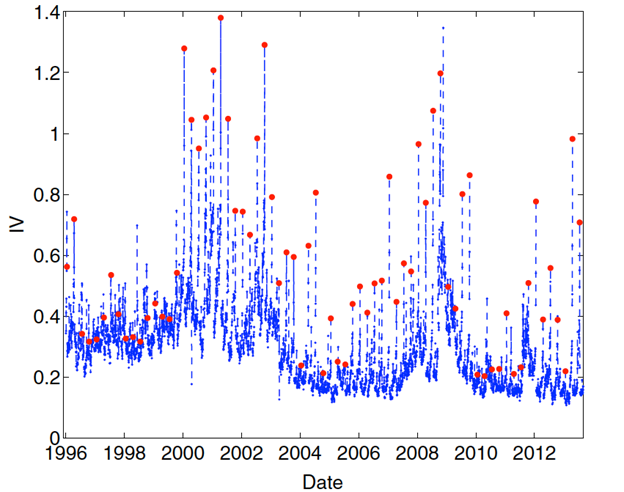 To illustrate that the increasing PEAIV is more than a coincidence, in Fig. 2 we plot the time series of the IV of the ATM call option for IBM from January1996 to August 2013. In the same figure, we mark in red the IV values on days during which EAs were made. As we can see, spikes in volatility most often coincide with the earnings release dates.