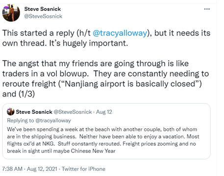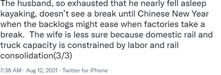 According to my friends, there is plenty of blame to go around. The cost of shipping containers has been rising steadily. That creates a self-fulfilling feedback loop. Those who can afford to do so are absorbing capacity at nearly any price, making others panicky and willing to pay ever higher prices. Covid has created port delays, most recently in China at the port of Ningbo and Nanjiang airport. These are on top of bottlenecks that exist at ports. Ships are idling off the port of Long Beach, California, with my friend attributing delays to both capacity at the docks and a shortage of truckers willing and able to move the containers once they are offloaded.