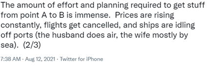 For some perspective, the husband deals primarily in air freight and the “last mile”. Companies that ship via air are either behind schedule or moving something that is perishable, like medicine. The wife tends to utilize sea and ground transportation to move items that are bulkier and less time critical than her husband’s. Between the two friends, both of whom have decades of experience in logistics, I received a crash course in logistics and the multitude of factors that are impeding the smooth flow of goods throughout the world.