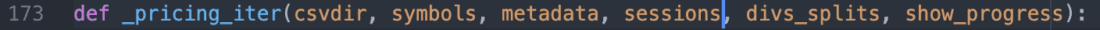 The function needed to modify in order to adapt our data into Zipline format is named _pricing_iter at line 171. This function reads the csv files and loads them into the Zipline DB.