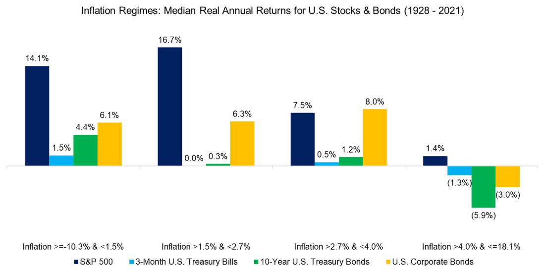 Given this, we calculate the real returns, which highlights that stocks and bonds generated the best average returns when inflation was below 1.5%. However, even in the high inflation regime of above 4%, stocks, treasury bills, and corporate bonds produced positive returns.