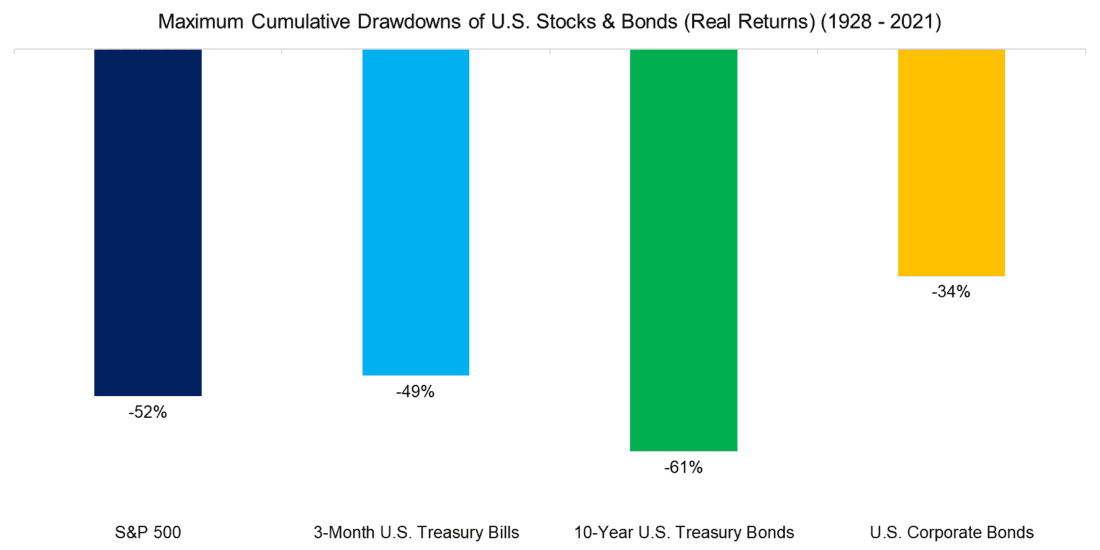 We can further illustrate the riskiness of bonds by highlighting the maximum drawdowns since 1928. Using real returns, this shows that Treasury Bills and Bonds were as risky as equities as drawdowns of approximately 50% were reached. The drawdowns would have been larger if we were using daily instead of annual returns