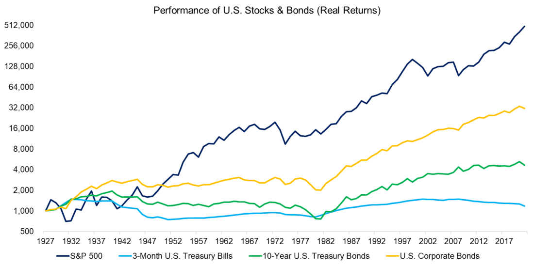 Plotting the performance of stocks and bonds using real returns highlights that stocks generated the highest return since 1928, as expected. This applies to most stock markets globally, except for those countries wrecked by wars or regimes (excellent data on how much money can be lost with stocks is found in Credit Suisse’s Global Investment Returns Yearbook series).