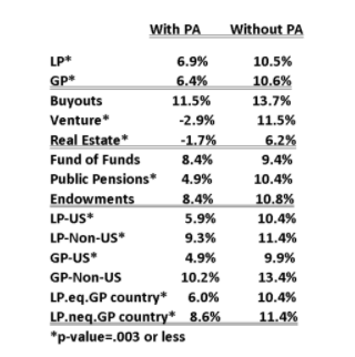 3. NO. The analysis of the relationship between fund returns and placement agents tested the difference between equally weighted IRRs for fund with PAs and those without PAs. They are sorted on fund type, investor type and geographic location of GP to LP. For all conditions, IRRs were higher for funds without agents than for funds with at least one agent. Take a look. The details are not pretty if one is a placement agent.