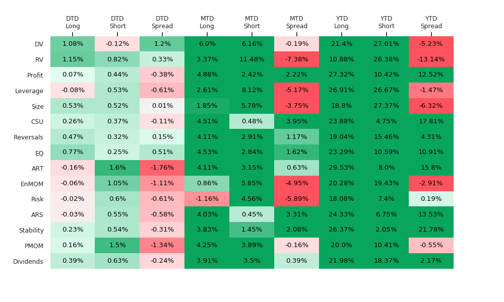 Please find below heatmaps with the DTD, MTD, YTD, 5 year, Post-07 & LTD returns for our ESBs as of last night’s close. Stay tuned for more composite signals on our ESBs which will continue to be added. These spreads are based on the best methodology (defined as highest cumulative return LTD) out of five that are available to clients for each of the ESBs as regards aggregation of factors within the Smart Beta cohorts. Customized heatmaps may be available based on all five methodologies: