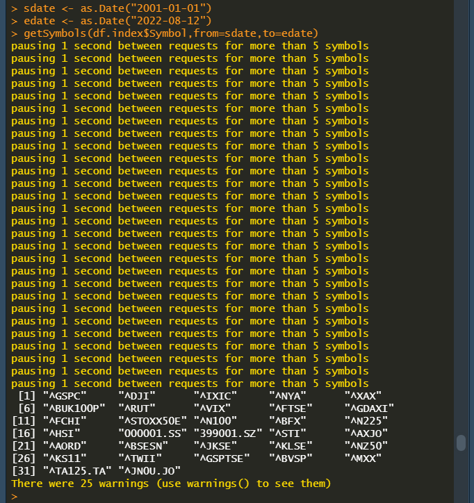 The following R code retrieves historical daily prices of selected stock indices given their symbols as of 2022-08-14.