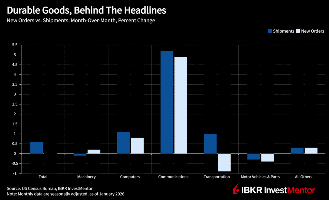 One of the most closely watched components, non‑defense capital goods excluding aircraft, often viewed as a proxy for business investment, was unchanged after rising the prior month. That suggests companies are still investing, but not accelerating their spending.