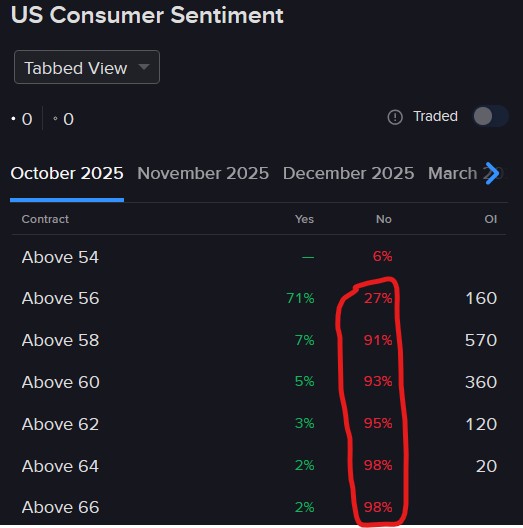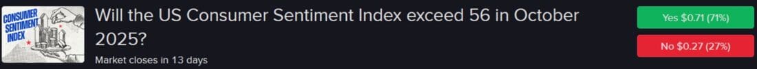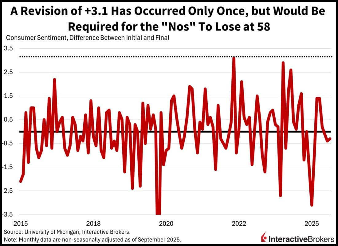 This morning’s University of Michigan (UMich) US Consumer Sentiment Index came in at 55; however, our forecast contracts are tied to the final release, which is due two Fridays from now on Oct. 24. Meanwhile, the revision history, or the difference between the initial and complete readings are particularly modest, with the average and median in absolute terms standing at 0.95 and 0.7. Against this backdrop, I find the “No” at 56 attractive because it costs just $0.27 and my pricing model shows that it should be at $0.80. The “Nos” at 58, 60, 62, 64 and 66 are also undervalued in my view, requiring adjustments of historic proportions to lose money. Those are ranging from $0.91 to $0.98.